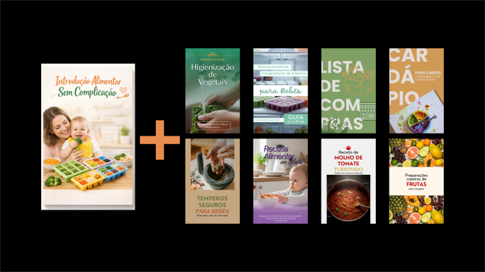 Você terá em mãos um guia completo que funcionará como seu manual oficial da introdução alimentar, trazendo clareza, organização e tranquilidade para essa fase tão importante.